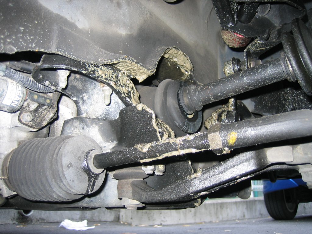 そこで今日の昼休みに下回りを覗いたらナ、ナ、ナント、ドライブシャフトブーツ内のグリスと思われる